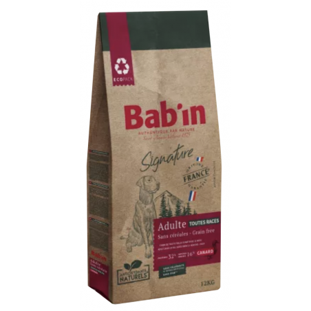 BAB’IN SANS CÉRÉALES ADULTE CANARD, riche en canard, répond aux besoins des chiens adultes intolérants aux céréales et au gluten. Son taux élevé de protéines d'origine animale de haute qualité (72%, canard et truite), combiné à des sources alternatives de glucides (pomme de terre, pois chiche, lentille blonde, pois jaune) en fait un aliment hautement digestible. Il contient une sélection de plantes, de la levure de bière et des graines riches en acides gras essentiels qui favorisent la bonne santé de la peau et du pelage. Il soutient les articulations grâce au complexe de glucosamine et chondroïtine.