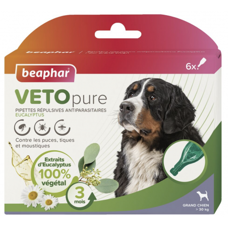 Beaphar a développé la gamme VETOpure, efficace contre les puces, les tiques et les moustiques. Conçues spécialement pour les chiens, les pipettes VETOpure repoussent les parasites externes, grâce à l'huile d'Eucalyptus et aux extraits de Chrysanthemum cinerariaefolium (fleurs de Pyrèthre de Dalmatie). Ces arbres et plantes sont reconnus pour leurs vertus répulsives contre les insectes. Si vous devez faire face à une infestation massive, il est recommandé de traiter aussi l’environnement de l’animal et l’habitat avec un insecticide de la gamme VETOpure de Beaphar, comme le spray, le pulvérisateur et les diffuseurs automatiques insecticides habitation.