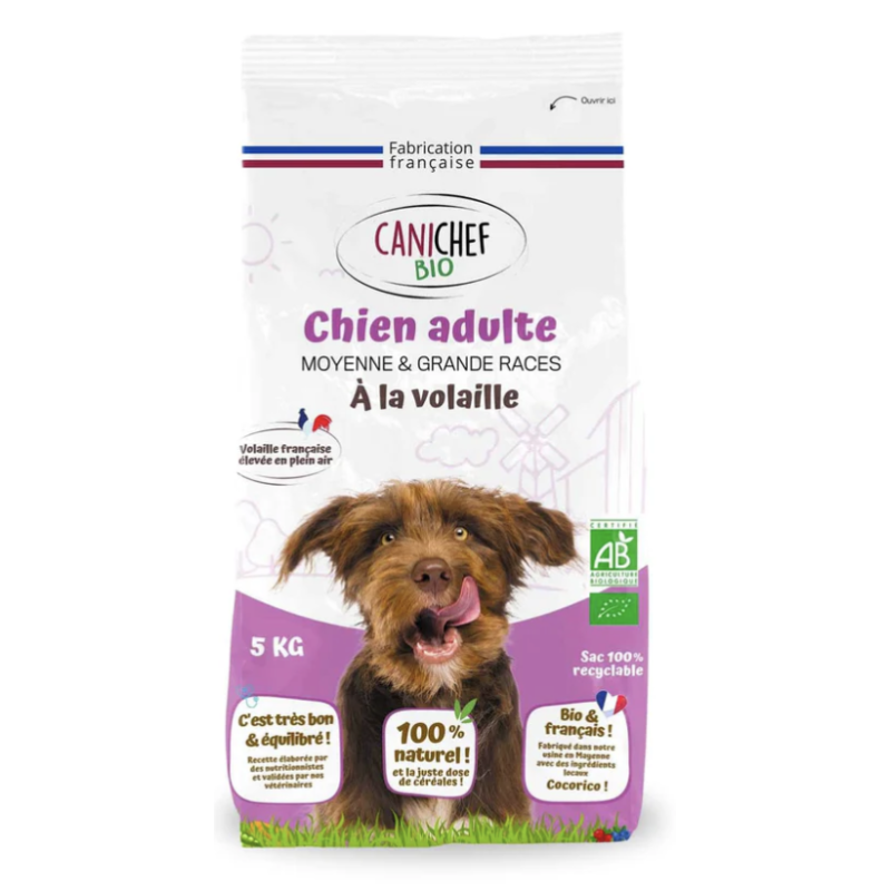- Croquettes 100 % fabrication française - Ateliers et gammes certifiés BIO par ECOCERT - 90% minimum de matières premières françaises - Volailles fermières bio élevées en plein air dans nos campagnes de l'Ouest Offrez aux chiens de moyenne et grande race le meilleur de la nutrition avec nos croquettes bio à la volaille. Riches en protéines de volaille...