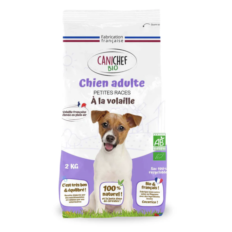 - Croquettes 100 % fabrication française - Ateliers et gammes certifiés BIO par ECOCERT - 90% minimum de matières premières françaises - Volailles fermières bio élevées en plein air dans nos campagnes de l'Ouest Offrez aux chiens de moyenne et grande race le meilleur de la nutrition avec nos croquettes bio à la volaille. Riches en protéines de volaille...