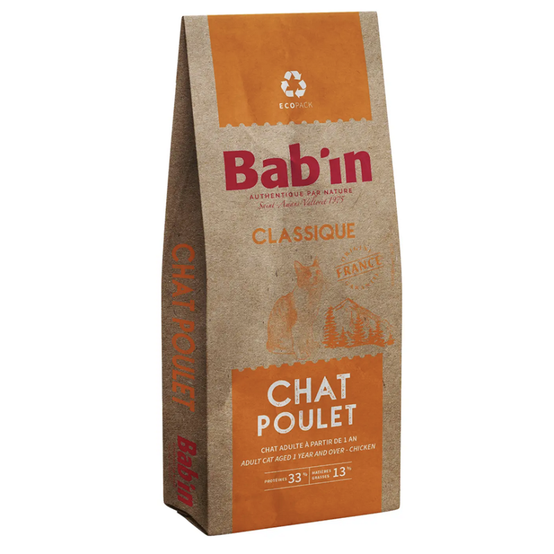 BAB’IN CLASSIQUE CHAT ADULTE, riche en poulet, est un aliment complet et équilibré pour le chat adulte. Il apporte tous les nutriments nécessaires à son équilibre et à sa bonne forme. Convient au chat non stérilisé et stérilisé.