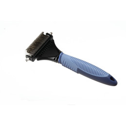 outil de toilettage pour chien ou chat équipé de 9 lames en acier, conçu pour couper et ouvrir facilement les nœuds et bourres dans les poils longs ou emmêlés, tout en limitant la douleur et la casse du poil. Il possède un manche ergonomique pour une bonne prise en main et est utilisé avant le brossage pour faciliter le démêlage.
