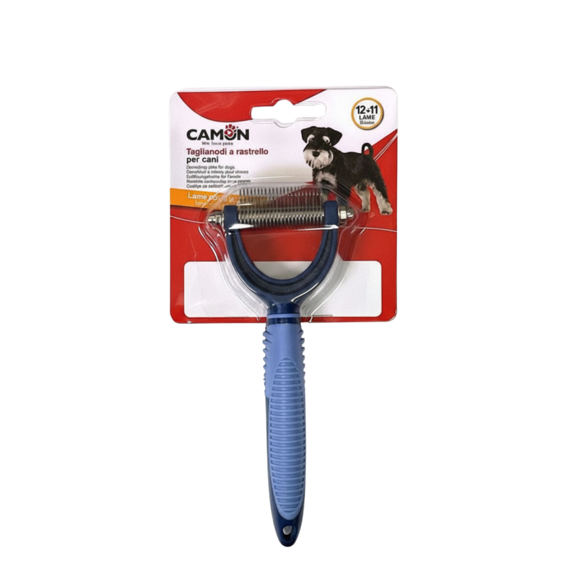 Le râteau démêleur 12+11 lames pour chien Camon est un accessoire de toilettage conçu pour éliminer efficacement les nœuds et les poils emmêlés. Grâce à ses lames en acier inoxydable et sa poignée ergonomique antidérapante, il permet de démêler le pelage de votre chien en douceur et en toute sécurité.