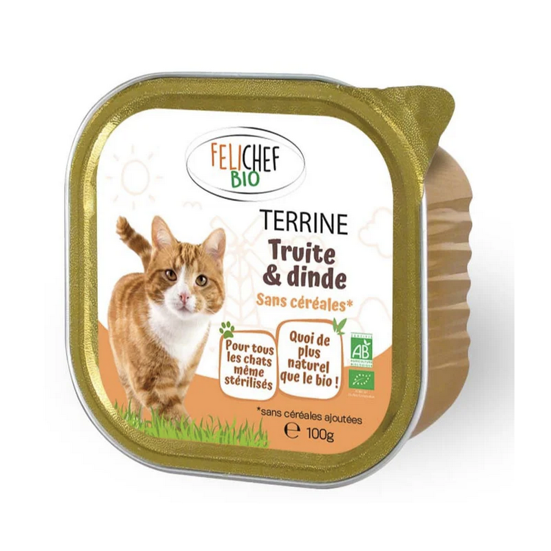 Offrez à votre félin un délicieux repas avec nos barquettes sans céréales bio saveur truite et dinde.
